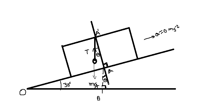 A plumb bob of mass 1 kg is hung from the ceiling of a train compartment. The train moves on an inclined plane with constant velocity. If the angle of incline is ${30^0}$. Find the angle made by the string with the normal to the ceiling. Also, find the tension in the string. $\left( {g = 10m{s^{ - 2}}} \right)$