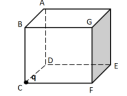 As can be seen in the above figure, the point charge placed at the corner C is touching the three faces of the cube, namely ABCD, CDEF, and BGFC. So the electric field through the charge will not be able to cut through these three faces. Therefore, the flux through all of these three faces will be equal to zero. Hence, the flux will pass through the rest of the three faces of the cube. Therefore, the flux passing through each of these three faces is given by