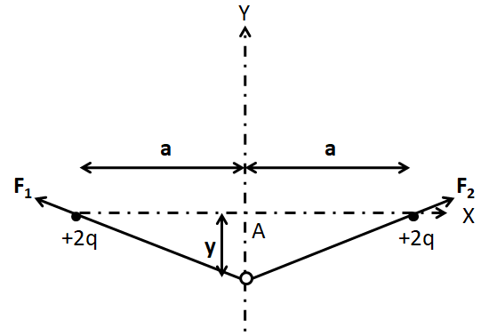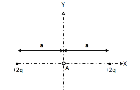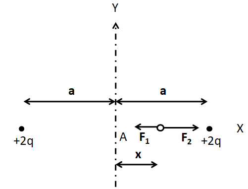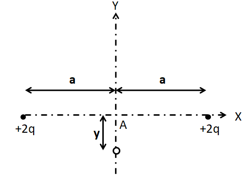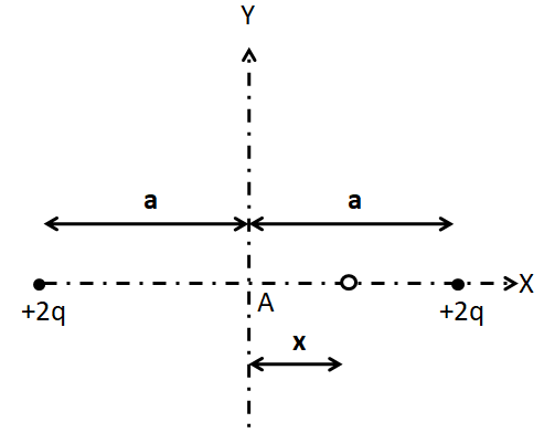 As can be seen in the given figure, the charge particle is symmetrically placed with respect to both of the charges of $ + 2q$. So the charge is in equilibrium at the point A. Now, for determining the nature of this equilibrium along the x and the y axis, we displace the charge through a small displacement along these directions separately.