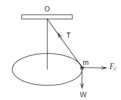A point mass m is suspended from the light thread of length l, fixed at O, and is whirled in a horizontal circle at a constant speed as shown. From your point of view, stationary with respect to the mass, then find the force on the mass.