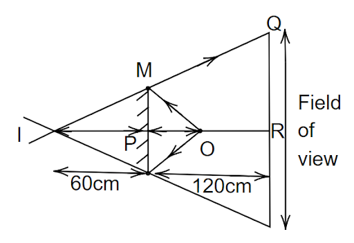 Consider a line parallel to the mirror, where a man is moving on it and a light source is placed at a distance of 60 cm and the length of the mirror is 50 cm. we need to find the distance between the extreme points where he can see the image of the light source in the mirror. From the figure, consider the triangle IMP and IQR which are similar to each other. Therefore, we can write as,