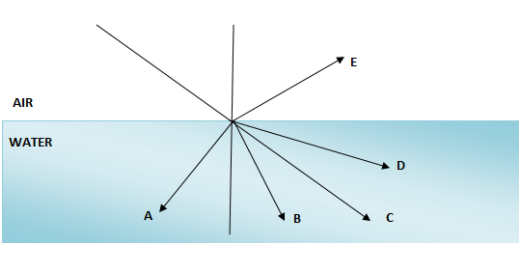 A ray of light from air suffers partial reflection and refraction at the boundary of water. In the figure, which of the rays A, B, C, D and E are the correct (i) refracted ray (ii) partially reflected ray?