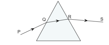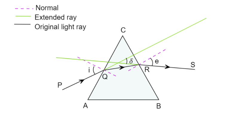 When the light travels through a prism, it is deviated two times during its course. First deviation occurs when it is incident on the prism, at point Q. The angle made by incident ray to the normal from the surface is represented by i, this ray is refracted inside by the glass prism.