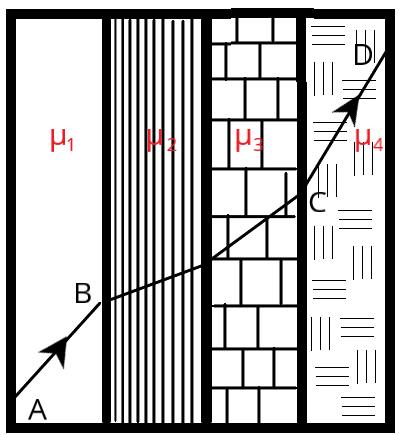 And, Snell’s law at C, ${\mu _4}\sin r = (1)\sin \theta $…… (2)