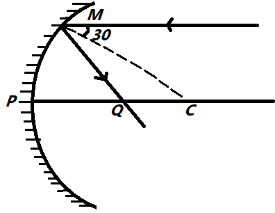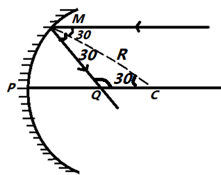 A ray parallel to the principal axis is incident at ${30^ \circ }$ from a normal concave mirror having radius of curvature $R$ . The point on principal axis where rays are focused is $Q$ such that $PQ$ is