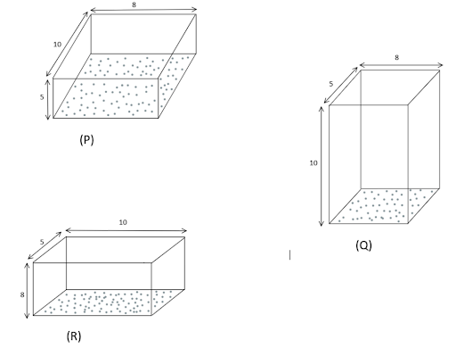 A rectangular block of size $10cm \times 8cm \times 5cm$ is kept in three different positions P, Q and R in turns as shown in the figure. In case, the shaded area is rigidly fixed and a definite force F is applied tangentially to the opposite face to deform the block. The displacement to the upper face will be ?