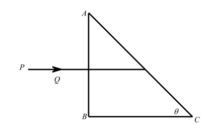 A right-angled prism made from a material of refractive index $\mu $ is kept in air. A ray PQ is incident normally on the side AB of the prism. Find (in terms of $\mu $ ) the maximum value of $\theta $ up to which this incident ray necessarily undergoes total internal reflection at the face AC of the prism.