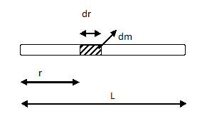 In the figure, we consider a small element of mass $dm$ and length $dr$ at a distance $r$from the end of the rod through which the rotating axis passes.
