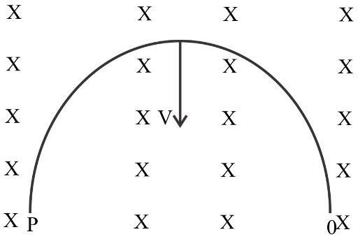 A semicircle loop PQ of radius $R$ is moved with velocity $v$ in transverse magnetic field as shown in fig. The value of induced emf at the end of the loop is