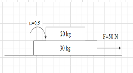 A small block of mass $20\,kg$ rests on a bigger block of mass $30\,kg$ , which lies on a smooth horizontal plane. Initially the whole system is at rest. The coefficient of friction between the block is 0.5. The horizontal force $F = 50\,N$ is applied on the lower block.