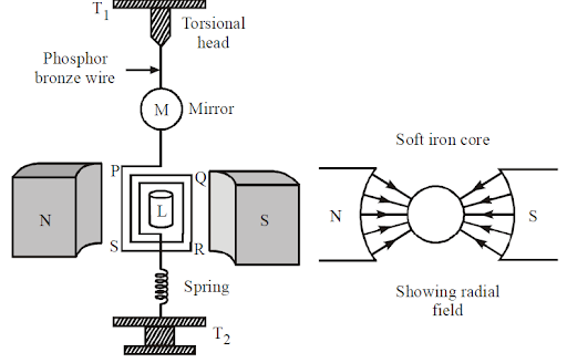 A radial field is produced by the poles of the magnet being bent. The lower end of the coil has a phosphor-bronze wire spring attached to it. Two terminals, $T_2$ and $T_1$, are attached to the spring and free ends of phosphor bronze wire, respectively, on the top of the instrument's casing. L has a soft iron core.