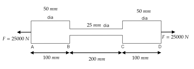 The length of part AB is ${l_{AB}} = 100{\text{mm}}$and its diameter is ${d_{AB}} = 50{\text{mm}}$ or its radius is ${r_{AB}} = 25{\text{mm}} = 0.025{\text{m}}$. Then its area will be ${A_{AB}} = \pi {r_{AB}}^2 = \pi {\left( {0.025} \right)^2}{{\text{m}}^2}$ .