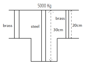 A steel rod of cross-sectional area \[16c{m^2}\] and two brass rods each of cross-sectional area \[10c{m^2}\] together support a load of \[500kg\] as shown in figure. Find the stress in the brass and steel rod (in\[kg/c{m^2}\]). Take $Y$ for steel \[ = {\text{ }}2.0 \times {10^6}kg/c{m^2}\] and for brass \[ = {\text{ }}1.0 \times {\text{ }}{10^6}kg/c{m^2}\].