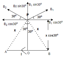 \[B = \dfrac{{\mathop \mu \nolimits_0 }}{{4\pi }}\dfrac{I}{{x\cos 30^\circ }}\left( {\sin 30^\circ + \sin 30^\circ } \right)\] on further solving this equation