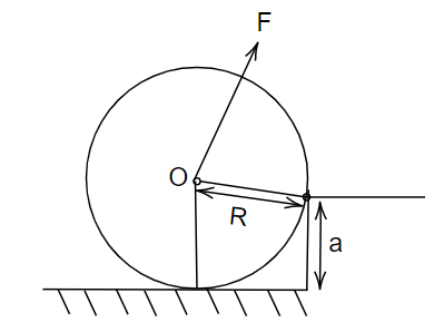 A uniform cylinder of mass M and radius R is to be pulled over a step of height \[\left( {a < R} \right)\]by applying a force F at its center ‘O’ perpendicular to the plane through the axes of the cylinder on the edge of the step (see figure). Then find the minimum value of F.