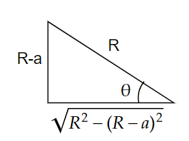 \[\cos \theta = \dfrac{{\sqrt {{R^2} - {{\left( {R - a} \right)}^2}} }}{R}\]