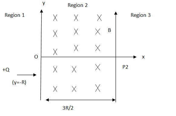 Thus, particles enter region 3 through point P2 on the x-axis as $r=\dfrac{13R}{8}$ is greater than $r = \dfrac{3R}{2}$.