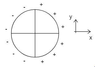 A uniform ring of mass $m$ and radius $R$ can rotate freely about an axis passing through the center $C$ perpendicular to the plane of paper. Half of the ring is positively charged and the other half of the ring is negatively charged. Uniform electric field ${E_a}$ is switched along –ve x-axis (axis are shown in figure).Find the angular velocity of the ring after rotation of 180 degrees. (Magnitude charge density $\lambda $ )