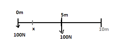 Let us consider that the center of mass will lie at a distance x from the left extreme. As the two weights of \[100N\] each are placed at \[0m\] and \[5m\] respectively hence the center of mass will lie somewhere between \[0m\] and \[5m\].