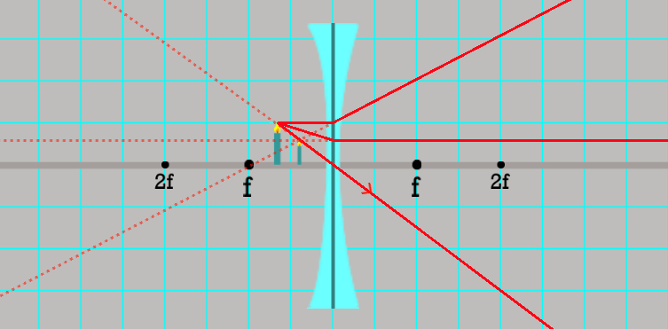 When an object is placed in front of a concave lens, the light ray emitted by the source passes through the lens axis and gets deflected away. The rays don't meet at a point on the other side of the concave lens, rather it meets virtually on the same side of the, which is erect and highly diminished.