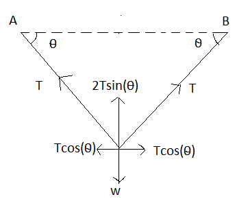 Hint: We draw the free body diagram of the following system to solve this question. We find the sum of forces acting upwards and downwards and equate them since there is horizontal force. Both the horizontal components of the two sides of the string get cancelled. So, the weight acting downwards is equal to the sum of upward forces.