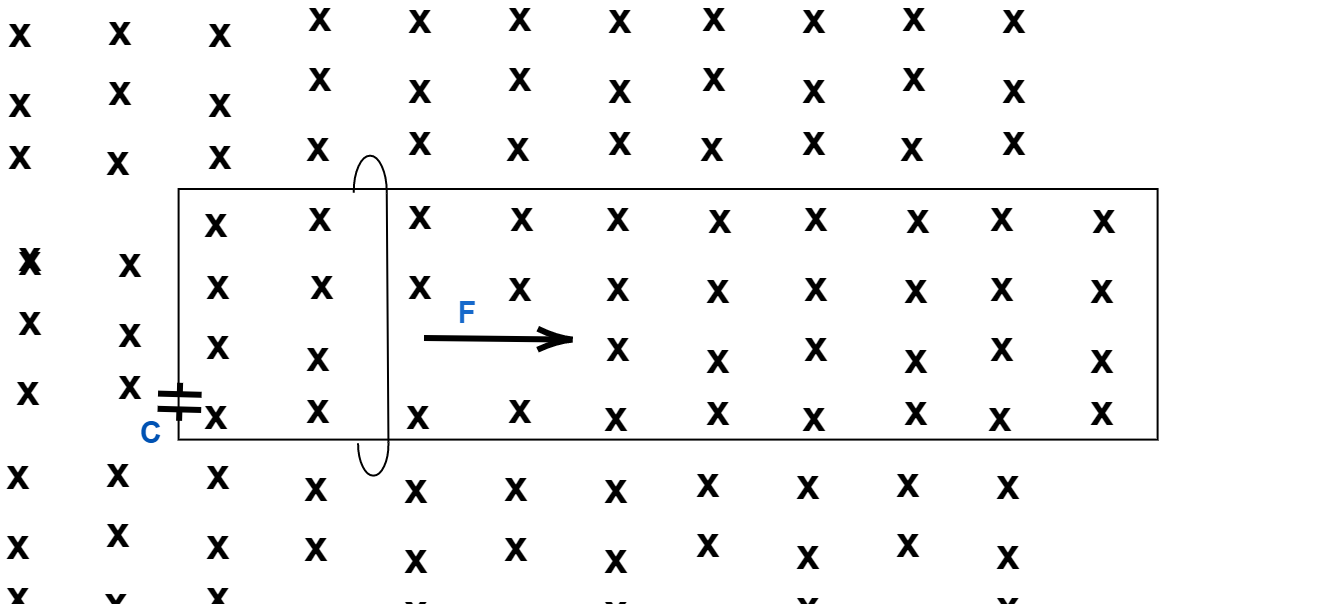A wire having mass m and length l can freely slide on a pair of parallel smooth horizontal rails placed in vertical magnetic field B. The rails are connected by a capacitor of capacitance C. The electric resistance of the rails and wires is zero. If constant force F acts on the wire as shown in the figure. Then acceleration of the wire can be given as-