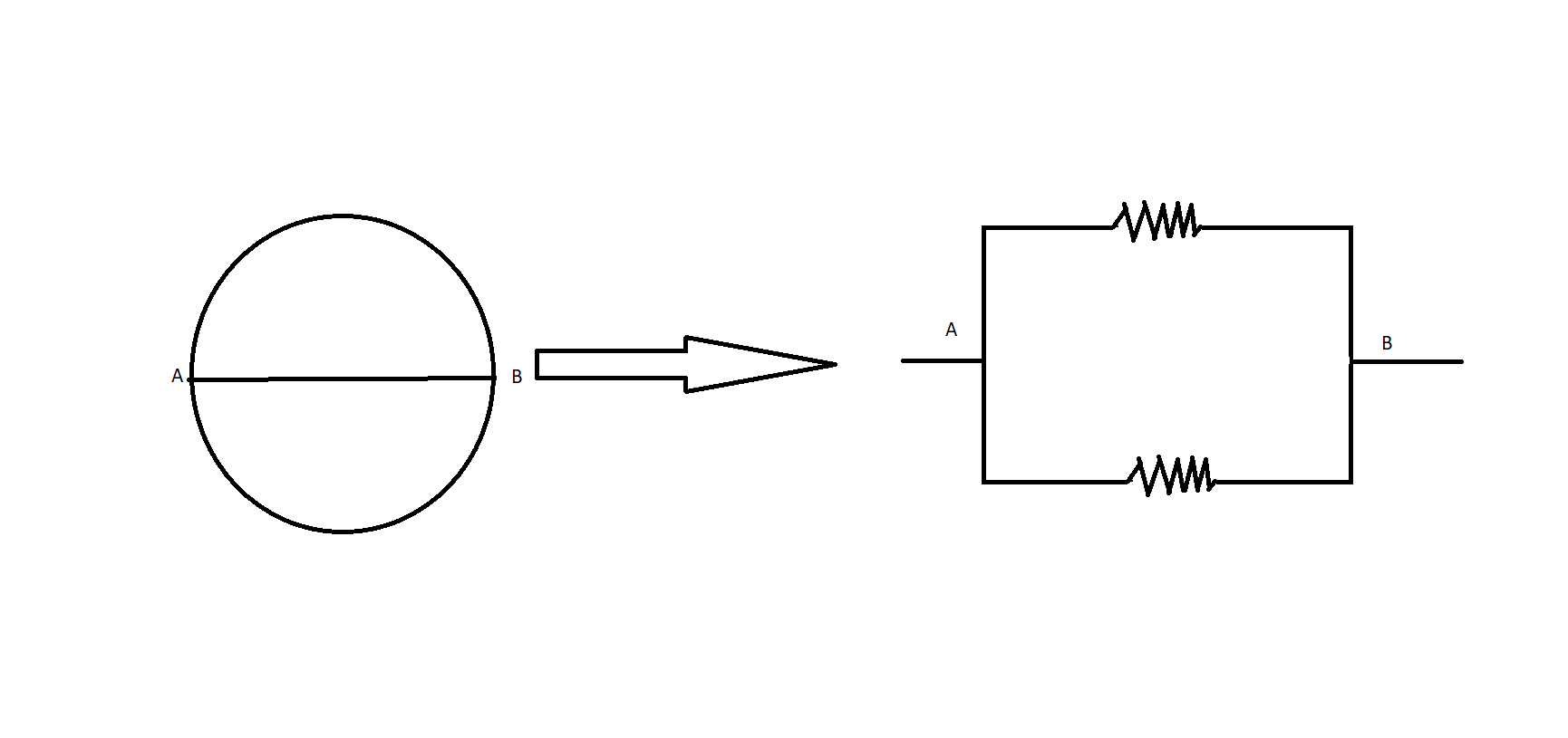 From the above figure, it can be concluded that the two arcs of the circle act as two parallel resistors across its diameter $AB$.