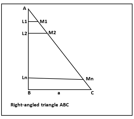 And ${{L}_{1}}{{M}_{1}},{{L}_{2}}{{M}_{2}},....,{{L}_{n}}{{M}_{n}}$ are line segments parallel to $BC$ and ${{M}_{1}},{{M}_{2}},...{{M}_{n}}$ are the points on $AC$ of the given triangle.