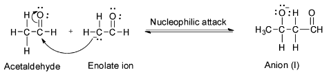 Step 2: Nucleophilic attack of the enolate on the second acetaldehyde molecule to form the anion (I).