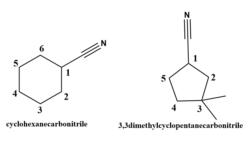 When the cyanide (\[ - CN\]) functional is group attached to the cycloalkane, The numbering starts from the carbon atom of cycloalkane which is directly attached to the cyanide group. The name of the cycloalkane is followed by the suffix -carbonitrile. The carbon atom of \[ - CN\]group is not involved in numbering.