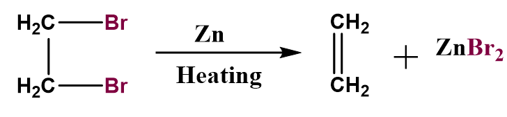 Now we can say when a solution of ethylene dibromide is heated with granular zinc(\[Zn\]) the formation of alkene is observed, that is the formation of ethylene molecules occurs.