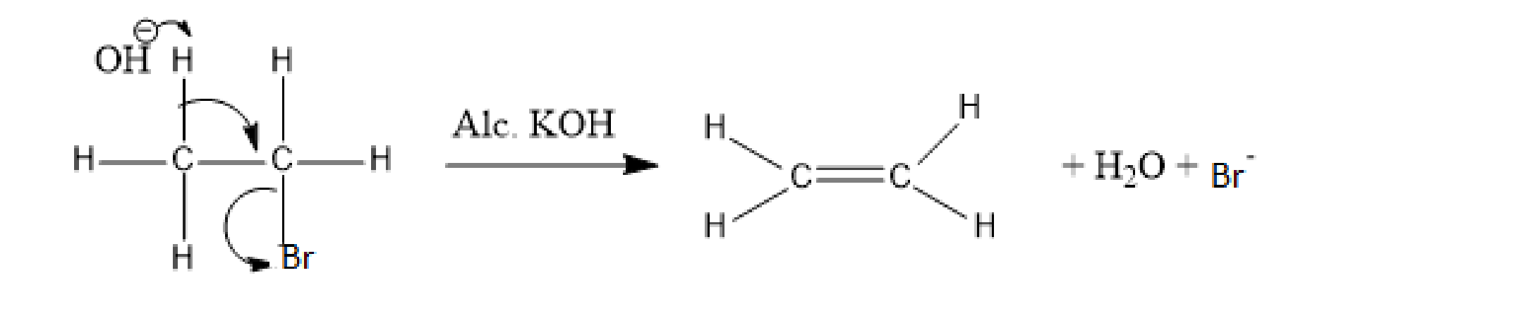For example, in the reaction of ethyl bromide with alcoholic KOH, the strong base, OH attracts a proton and the Br atom leaves the compound. This results in the formation of an unsaturated compound, that is, ethene or ethylene.
