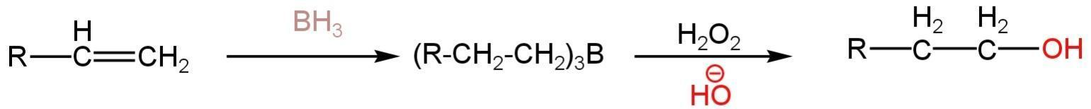 The resulting trialkyl borane is reacted with hydrogen peroxide in the second step.