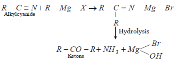 Thus we can write that Alkyl cyanides when react with Grignard reagent, the product on hydrolysis found is ketone.