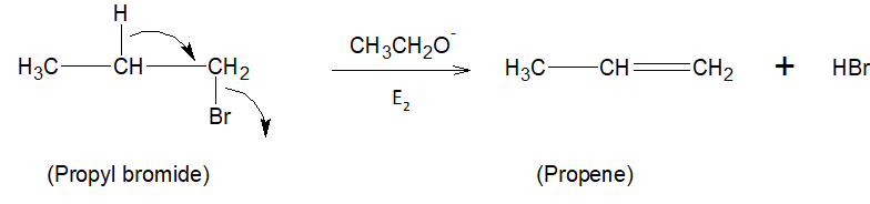 As we know the polarity between carbon-bromine bonds increases by increasing the +I effect which can be increased by increasing the alkyl group. Therefore between options C and D, a higher number of alkyl groups are present in compound D, propyl bromide than compound C. In the presence of strong base ${{C}_{2}}{{H}_{5}}{{O}^{-}}$, propyl bromide formed propene by ${{E}_{2}}$ reaction.