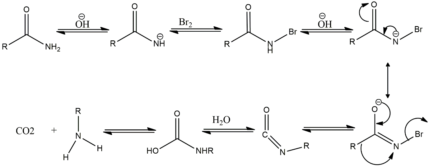 At first hydroxyl ion of the base \[KOH\]accepts \[{H^ + }\]from \[N\]of amide functional group to form an \[RCON\]intermediate, then \[B{r^ + }\]of \[B{r_2}\]attacks on \[{N^ - }\]of intermediate to form\[RCONHBr\]. Then again, the base accepts another \[{H^ + }\]of the amide functional group. Now, the \[R\]group migrates to Nitrogen and \[Br\]ion leaves as it is a leaving group and gives an \[RNCO\]intermediate. After that, proton and hydroxyl ions of water get added to the intermediate and give carbamic acid which gives amine as a final product with the loss of carbon dioxide gas.