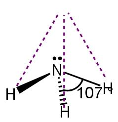 In \[~N{{H}_{3}}\](\[s{{p}^{3}}\]), there is one lone pair on nitrogen present (occupy equatorial position) repelling the entire three bond (between hydrogen and nitrogen) at around 107 degree. This gives a trigonal pyramidal structure of ammonia.