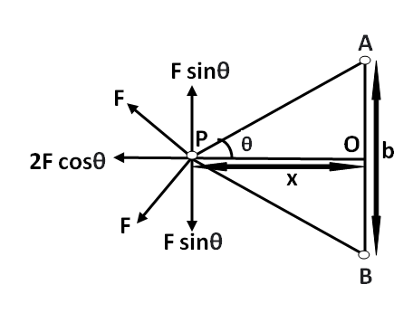 \[{F_{net}} = 2F\dfrac{x}{{{{\left( {{x^2} + \dfrac{{{b^2}}}{4}} \right)}^{\dfrac{1}{2}}}}}\] ...(1)
