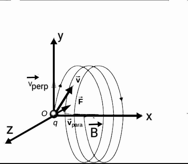 Let an electron with charge $q$ projecting with a velocity $\vec{v}$ along the axis of a circular conductor in a magnetic field $\vec{B}$ is given by the following expression,