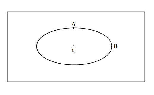 An ellipsoidal cavity is carved within a perfect conductor. A positive charge q is placed at the centre of the cavity. The points A and B are on the cavity surfaces as shown in the figure. Then: