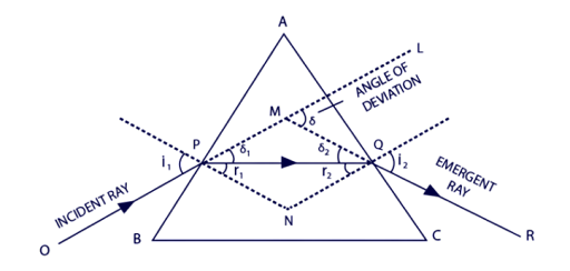 In the image above, i=incident angle, $r_1$=refractive angle of surface PQ, $r_2$= refractive angle of surface PR, e=angle of emergence and δ=total angle of deviation.