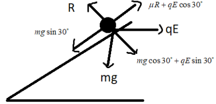 \[f = mg\sin {30^ \circ } - (qE\cos {30^ \circ } + \mu R)\], where f is considered along the line of inclination