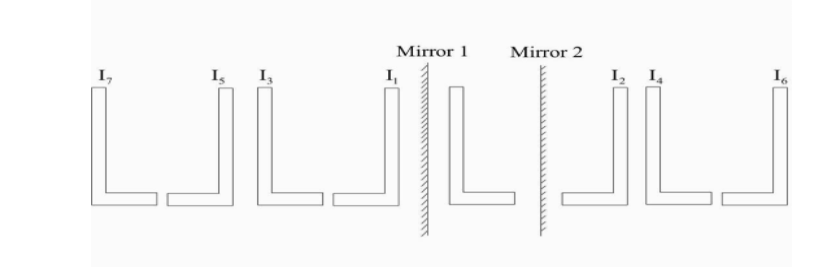 Now image \[\mathop I\nolimits_1 \] acts as object 2 for mirror 2 and produces image $I_4$. Similarly, image \[\mathop I\nolimits_2 \]acts as an object 1 for mirror 1 and produces image $I_3$. Now image \[\mathop I\nolimits_3 \] will act as an object for mirror 1 and produce images \[\mathop I\nolimits_4 \] and the process will continue till the formation of 7 images. When these images first act as an object they produce non – laterally inverted images.