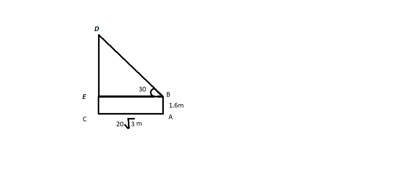 An observer 1.6 m tall is $20 \sqrt{3}$ m away from a tower. The angle of elevation from his eye to the top of the tower is 30°. The height of the tower is