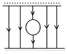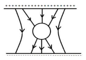 An uncharged sphere of metal is placed inside a charged parallel plate capacitor. The lines of force will look like: