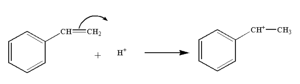 In the second step, the hydrogen ion attack the double bond and a carbocation complex is formed.