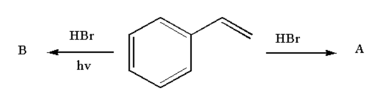 Hint: The chemical name of HBr is hydrogen bromide. In the given reaction it should be noted that one reaction is taking place in presence of light and other in the absence of light. The reaction taking place in the presence of light forms free radicals.
