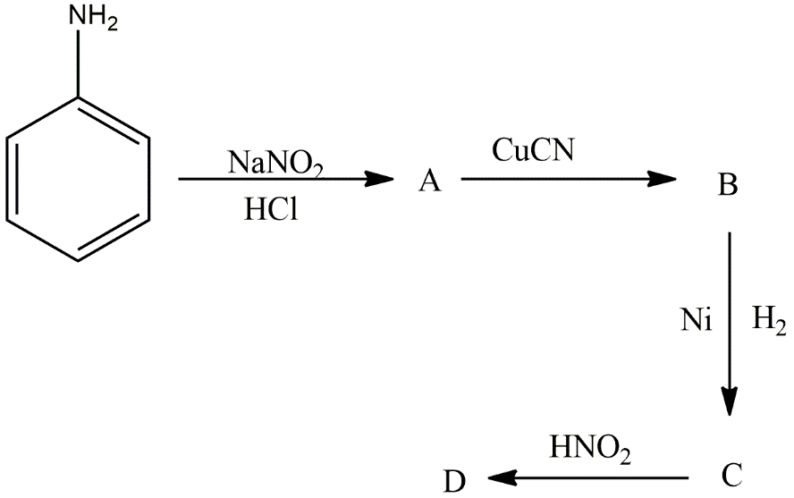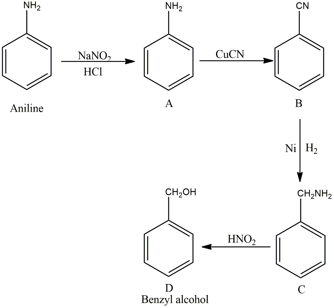 In the first step, \[\left( {NaN{O_2} + HCl} \right)\]reacts with each other to form nitrous acid\[\left( {HONO} \right)\], which reacts with aniline to give a diazotization reaction and form benzene diazonium chloride salt product (A). This product (A) further reacts with copper cyanide \[\left( {CuCN} \right)\]to give a Sandmayer’s reaction and forms cyano benzene or benzonitrile product (B). Then product (B) reacts with hydrogen gas in presence of nickel catalyst to give benzylamine (C) by reduction, which further reacts with nitrous acid \[\left( {HONO} \right)\]which is an oxidising agent and forms benzyl alcohol, the final product (D). The reaction mechanism is shown below: