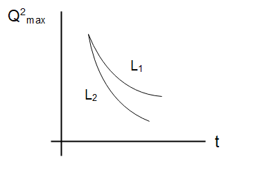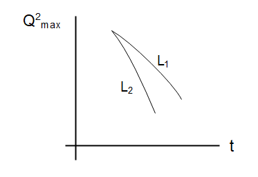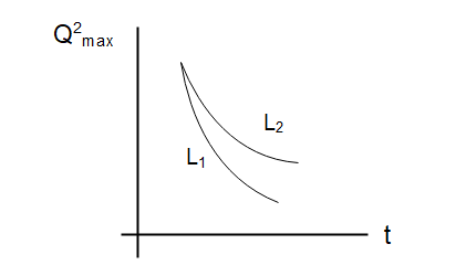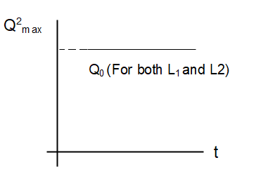 An LCR circuit is equivalent to a damped pendulum. In an LCR circuit, the capacitor is charged to ${Q_0}$ and then connected to the L and R as shown above. If a student plots graphs of the square of maximum charge \[Q_{\max }^2\]on the capacitor with time (t) for two different values \[{L_1}\,\;{\text{and}}\;{L_2}\]\[\left( {{L_1}\, > {L_2}} \right)\] of $L$ then which of the following represents this graph correctly? (plots schematic and not drawn to scale)