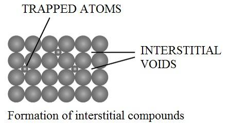 Note: Presence of some atoms like ${\rm{N,C}}$or ${\rm{H}}$ trapped in the vacant spaces in the crystal lattice gives rise to the interstitial compounds. The melting points of these compounds are higher than that of pure metals due to bonding between the metal and the non-metals, which is stronger than the metal-metal bonding.